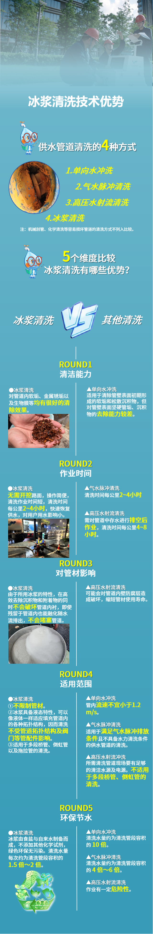 隨著生活水平的提高,人們對飲用水品質(zhì)的需求也不斷提升。《指南》的發(fā)布,為解決管網(wǎng)二次污染的行業(yè)痛點(diǎn)怎樣選擇清洗方法提供了科學(xué)依據(jù)。《指南》中對單向水沖洗、氣水脈沖清洗、高壓水射流清洗、冰漿清洗這4種清洗方法的適用場合和特點(diǎn)做了科學(xué)分析。