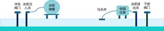 冰漿清洗技術(shù)是將冰漿加注進(jìn)管道內(nèi),使冰漿在管道內(nèi)形成一段柔軟的“冰活塞”,再利用市政管道上游水壓推動“冰活塞”向前移動,在移動時冰漿與管道內(nèi)壁發(fā)生碰撞及摩擦,使管底沉積物與管壁附著物的穩(wěn)定結(jié)構(gòu)遭到破壞,從而剝離管壁并隨著冰漿一起向前移動直至排出管道,最終達(dá)到清洗管道的目的。