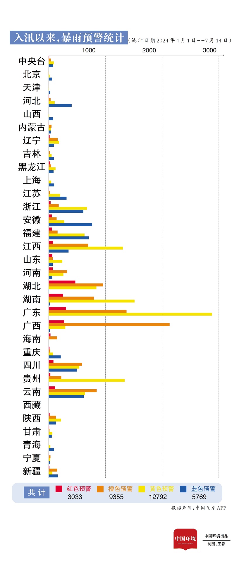 單月暴雨紅色預(yù)警同比增加61.1% 梳理發(fā)現(xiàn),4月1日入汛以來,全國(guó)發(fā)布?xì)庀箢A(yù)警信息16萬條,其中暴雨預(yù)警氣象災(zāi)害預(yù)警信息達(dá)到3萬余條,占比18.83%。據(jù)統(tǒng)計(jì),截止7月14日,中央氣象臺(tái)共計(jì)發(fā)布暴雨紅色預(yù)警9次。從全國(guó)情況來看,廣東發(fā)布暴雨預(yù)警信息4569條,湖北發(fā)布暴雨紅色預(yù)警信息多達(dá)470條。
