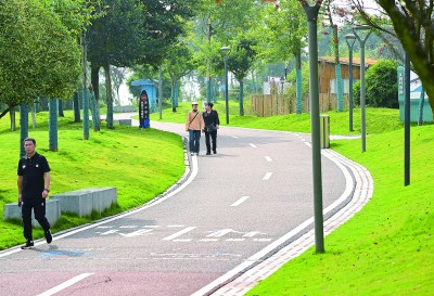 市民在四川宜賓市南溪濱江濕地公園綠道內(nèi)散步。新華社發(fā)