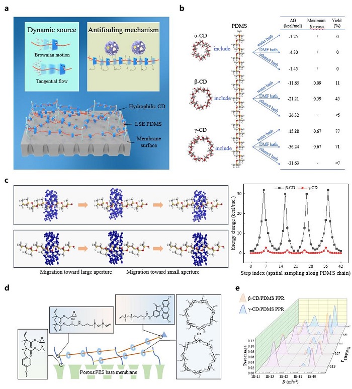 針對上述問題,團隊提出使用超分子而非高分子在水處理膜表面構建抗污染層的策略。超分子為由聚二甲基硅氧烷(PDMS)和環糊精(CD)組成的聚輪烷。PDMS為低表面能線性大分子,CD是親水環狀小分子,CD-PDMS聚輪烷呈線穿環結構。CD可沿PDMS鏈滑動、旋轉和振動,形成相對動態親水-低表面能非均相微區。這一結構可使污染物與膜表面的接觸不穩定,輔以CD的布朗運動,能夠在低切向流,甚至靜態條件下有效驅除膜表面污染物。此外,還可防止低表面能組分團聚,并通過氫鍵作用攜帶并促進水分子傳輸。